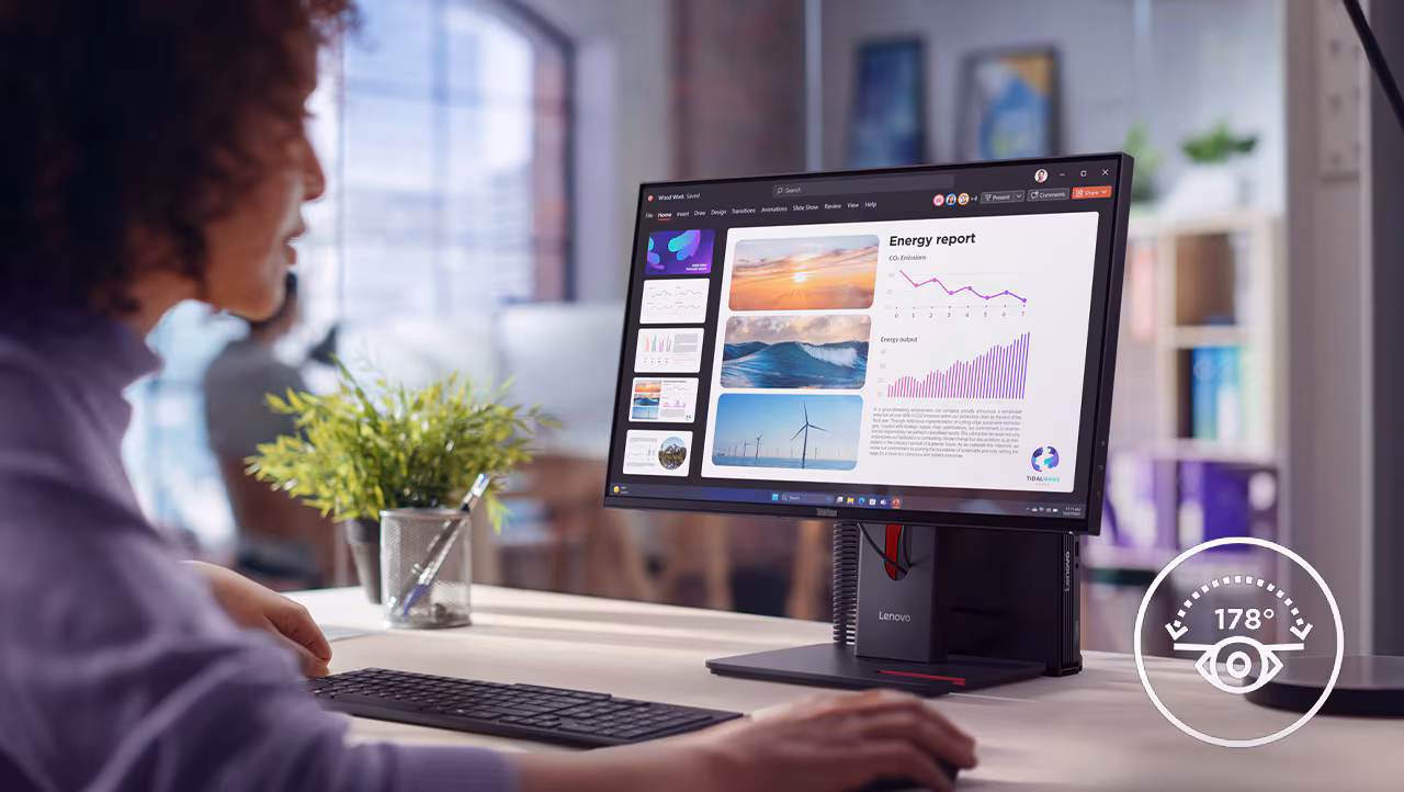 Monitor ThinkVision T24-40 je vybaven 23,8palcovým FHD IPS displejem s širokým barevným gamutem 99 % sRGB a 99 % BT.709, který poskytuje živý obraz z jakéhokoli úhlu pohledu. Přizpůsobte obrazovku svému pracovnímu postupu díky dynamické obnovovací frekvenci monitoru 48–120 Hz. Dynamicky se přizpůsobuje obsahu na obrazovce, což vede k plynulejšímu pohybu u rychle se pohybujících obrázků nebo ke snížení spotřeby energie při prohlížení statických obrázků. Integrovaná technologie Natural Low Blue Light chrání vaše oči před únavou i během dlouhých pracovních hodin. Pětihvězdičková certifikace TÜV Rheinland Eye Comfort zajišťuje, že škodlivé modré světlo je výrazně sníženo více než kdykoli předtím.