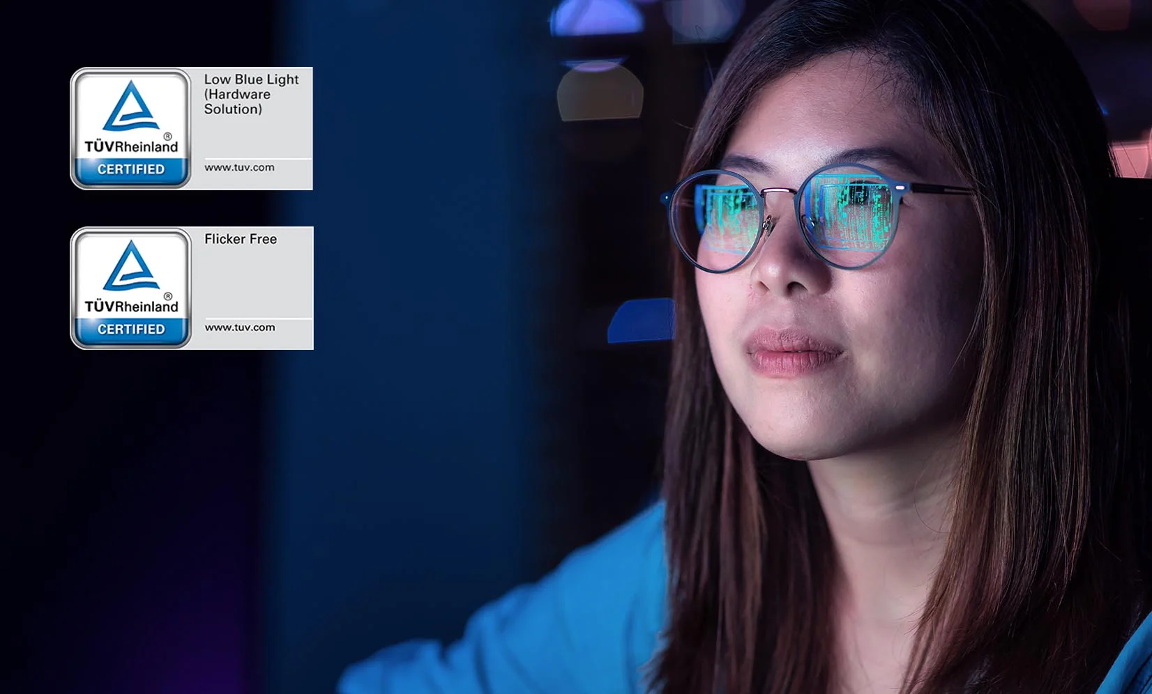 Pracujte pohodlně po dlouhé hodiny bez únavy očí díky hardwarové technologii monitoru s nízkým obsahem modrého světla a bez blikání.