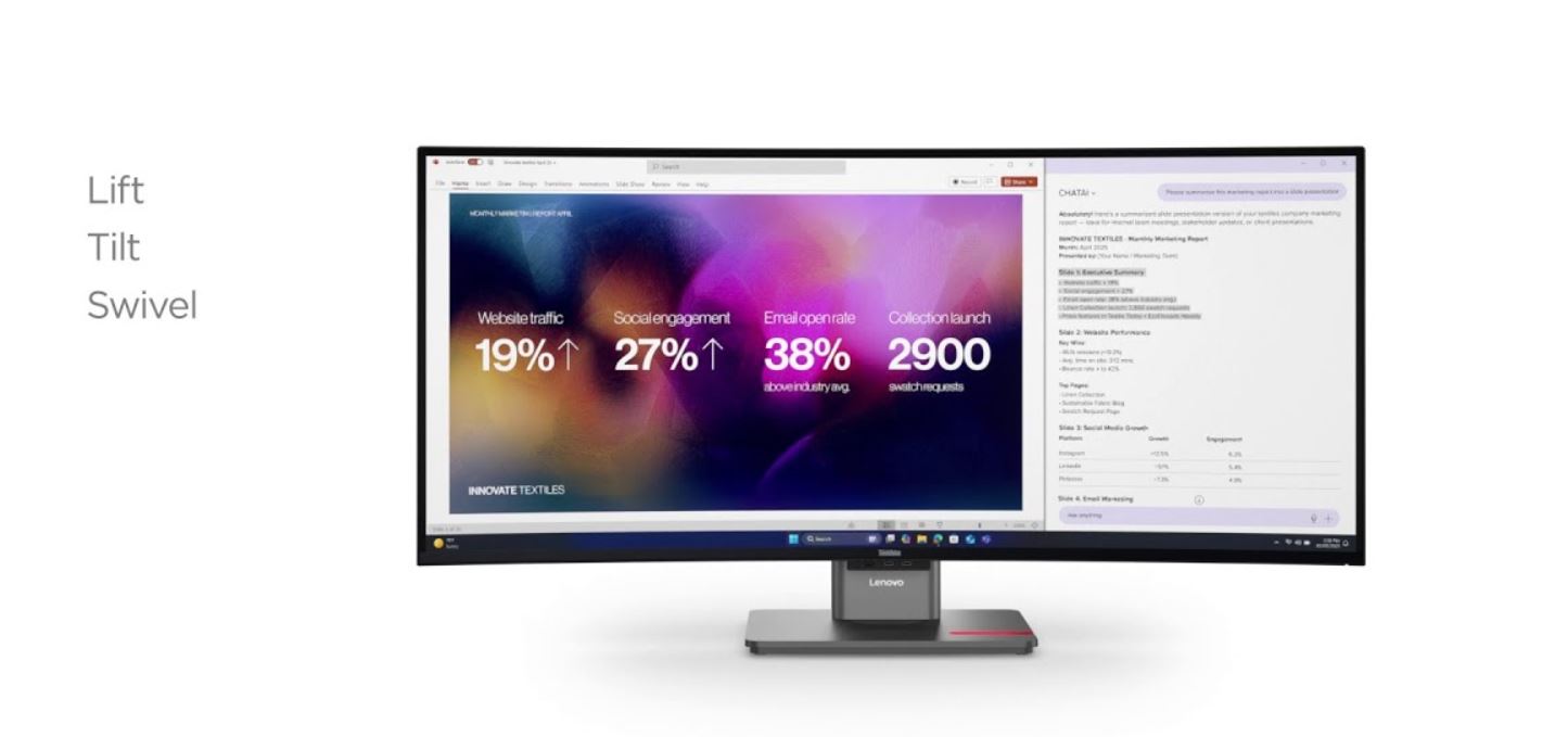 Patentovaná technologie True Split od společnosti Lenovo umožňuje plynulý multitasking a spolupráci díky rozdělení ultraširokého monitoru na přizpůsobitelné sekce pro efektivní pracovní postupy. Integrovaná funkce (e)KVM přepínače dále zefektivňuje pracovní postupy s více zařízeními a umožňuje vám dosáhnout více s menším úsilím.