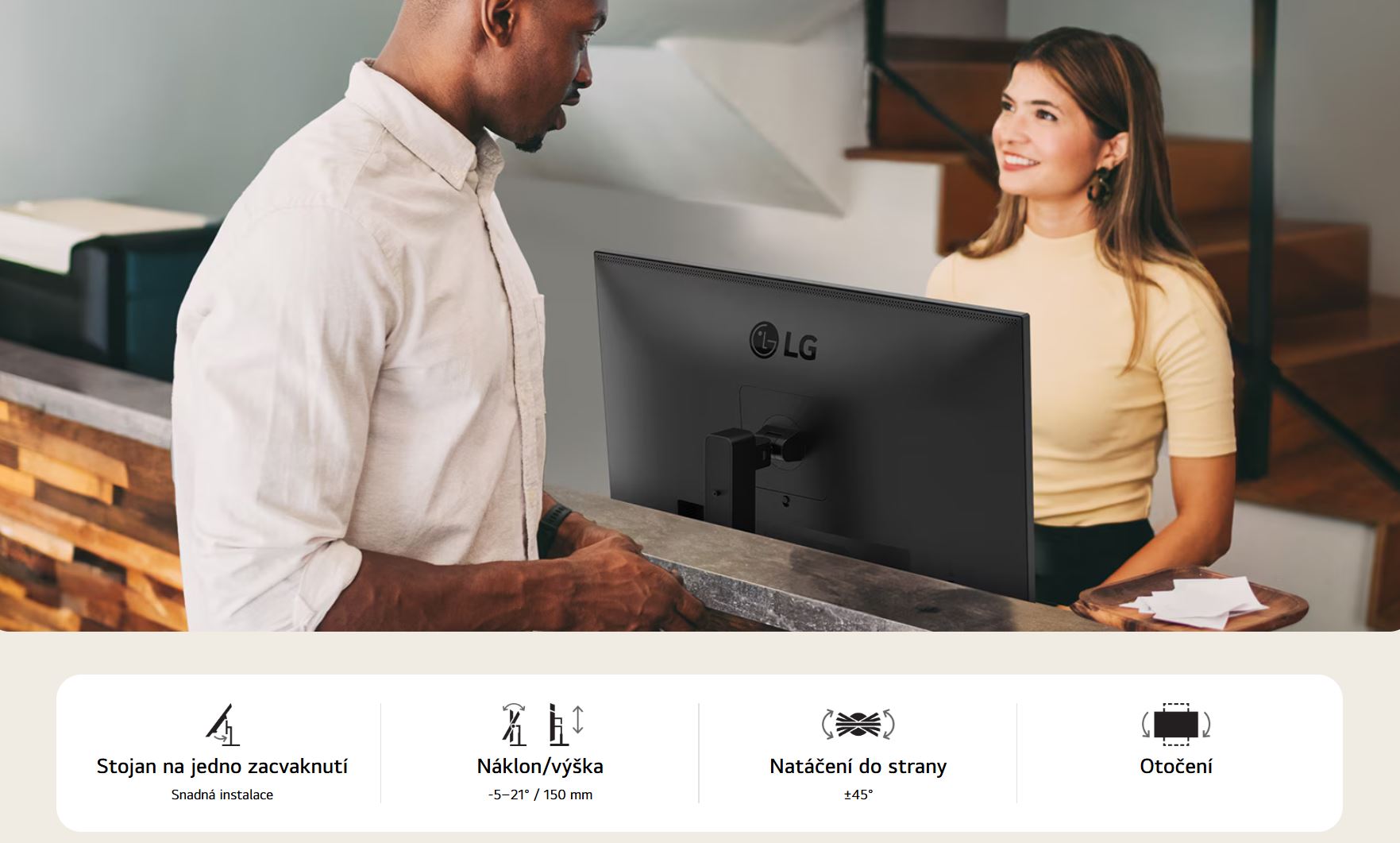 Monitor 24BA55W podporuje nastavení náklonu, natočení do strany, otočení a výšky, takže si každý, kdo tráví před monitorem dlouhou dobu, může vytvořit komfortní pracoviště. Náš ergonomický stojan také usnadňuje komunikaci se zákazníky nebo kolegy, protože umožňuje nastavení výšky směrem dolů.