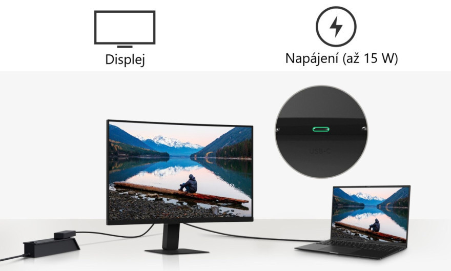Připojte notebook k monitoru kabelem USB-C a získejte až 15W napájení a možnost připojení displeje.