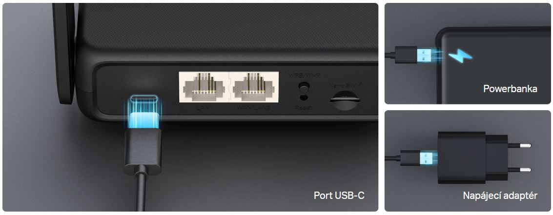 Díky portu USB-C podporuje MB113-4G také nabíjení z powerbanky. Napájejte jej kdekoli, i na cestách bez elektrické zásuvky.