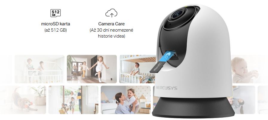 Uložte všechny své důležité okamžiky na microSD kartu (až 512 GB) nebo si po bezplatné zkušební verzi předplaťte službu MERCUSYS Camera Care pro cloudovou službu.