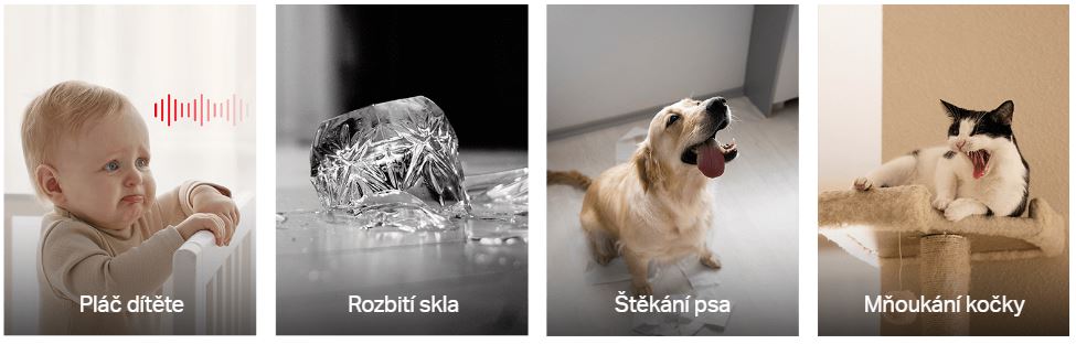 Prostřednictvím analýzy podporované umělou inteligencí systém identifikuje pláč dítěte, rozbití skla a zvuky vydávané domácími zvířaty, čímž zajišťuje, že obdržíte včasná upozornění na zvuky, které vyžadují vaši reakci.