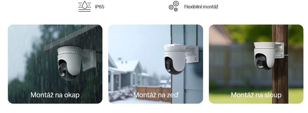 Díky odolnosti proti povětrnostním vlivům IP65 je kamera odolná proti dešti, prachu a sněhu. Ideální pro venkovní použití od slunečných dnů po bouřlivé noci. Podporuje montáž na zeď, sloup a strop, takže ji můžete nainstalovat tam, kde vám to vyhovuje.