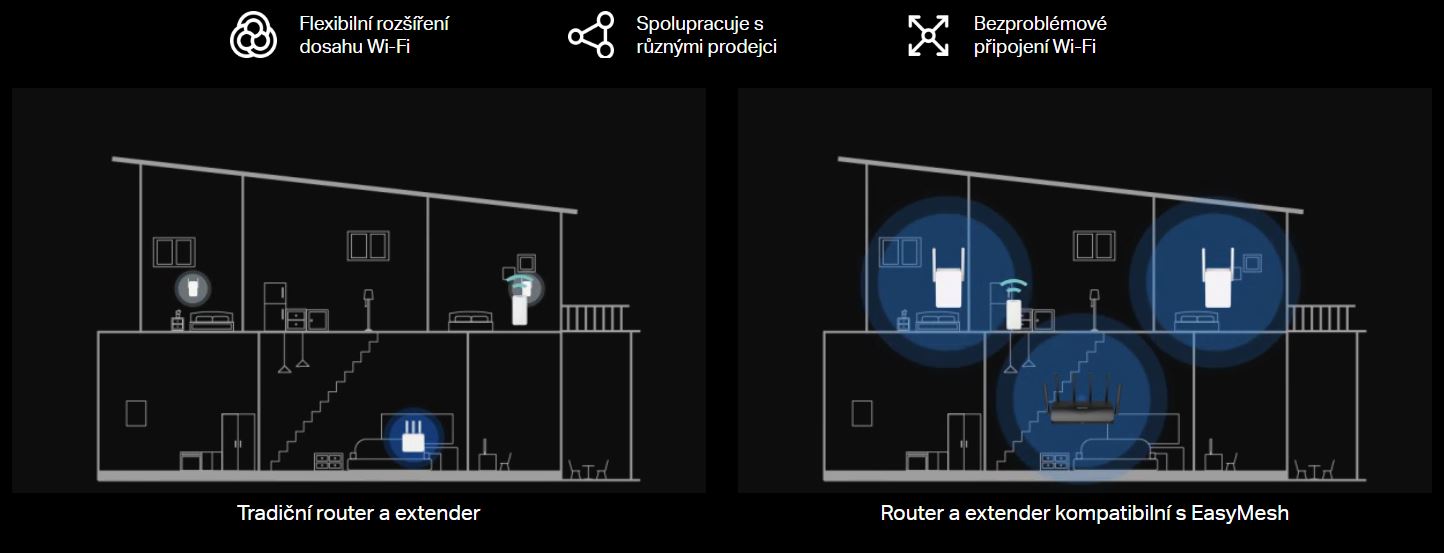 Zařízení MR37BE je kompatibilní se systémem EasyMesh, což vám umožní vytvořit celou domácí síť mesh s jedním jménem a heslem Wi-Fi s jakýmkoli jiným přístupovým bodem, který podporuje EasyMesh od různých výrobců. Užívejte si flexibilní, škálovatelnou a bezproblémovou mesh Wi-Fi v celé domácnosti!