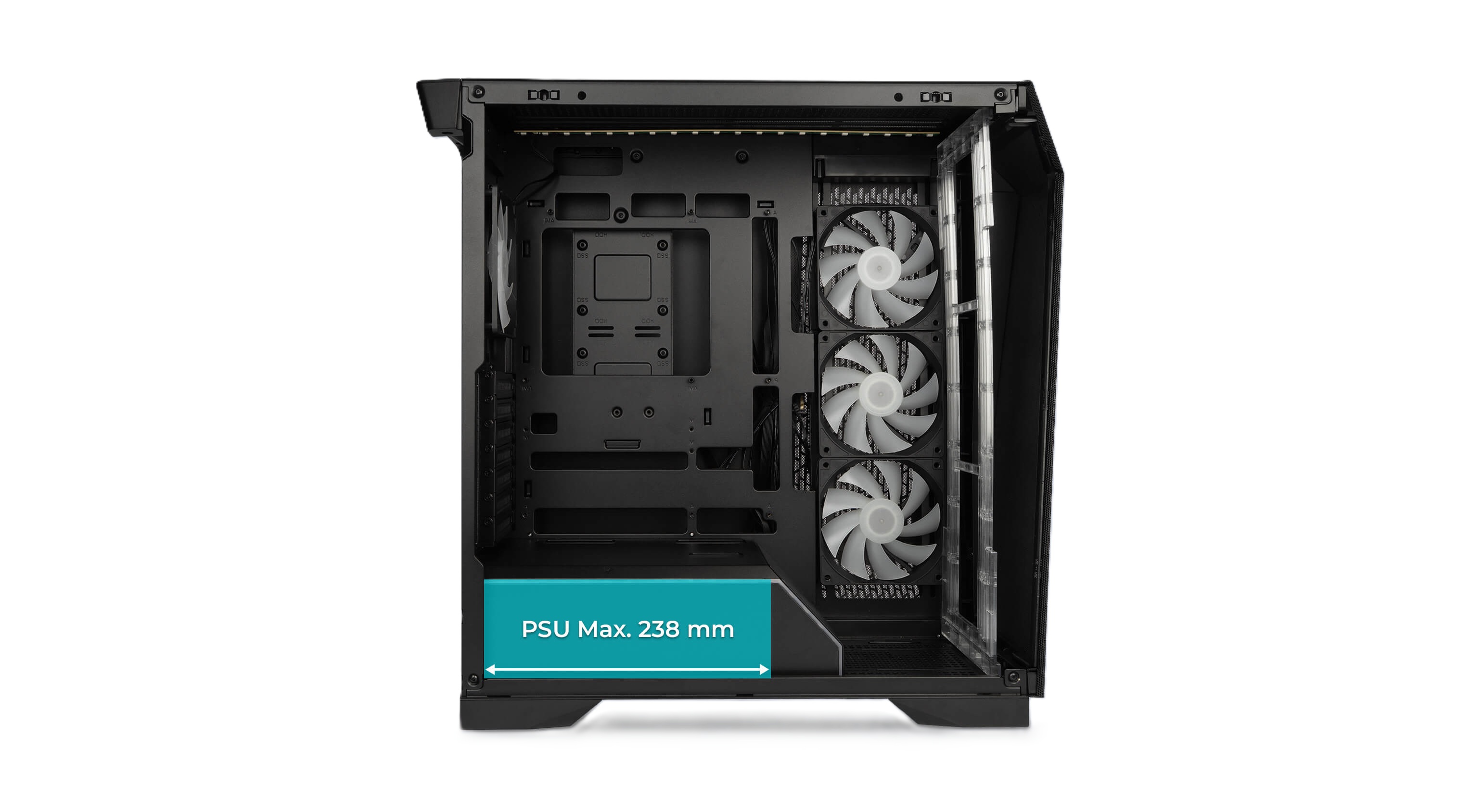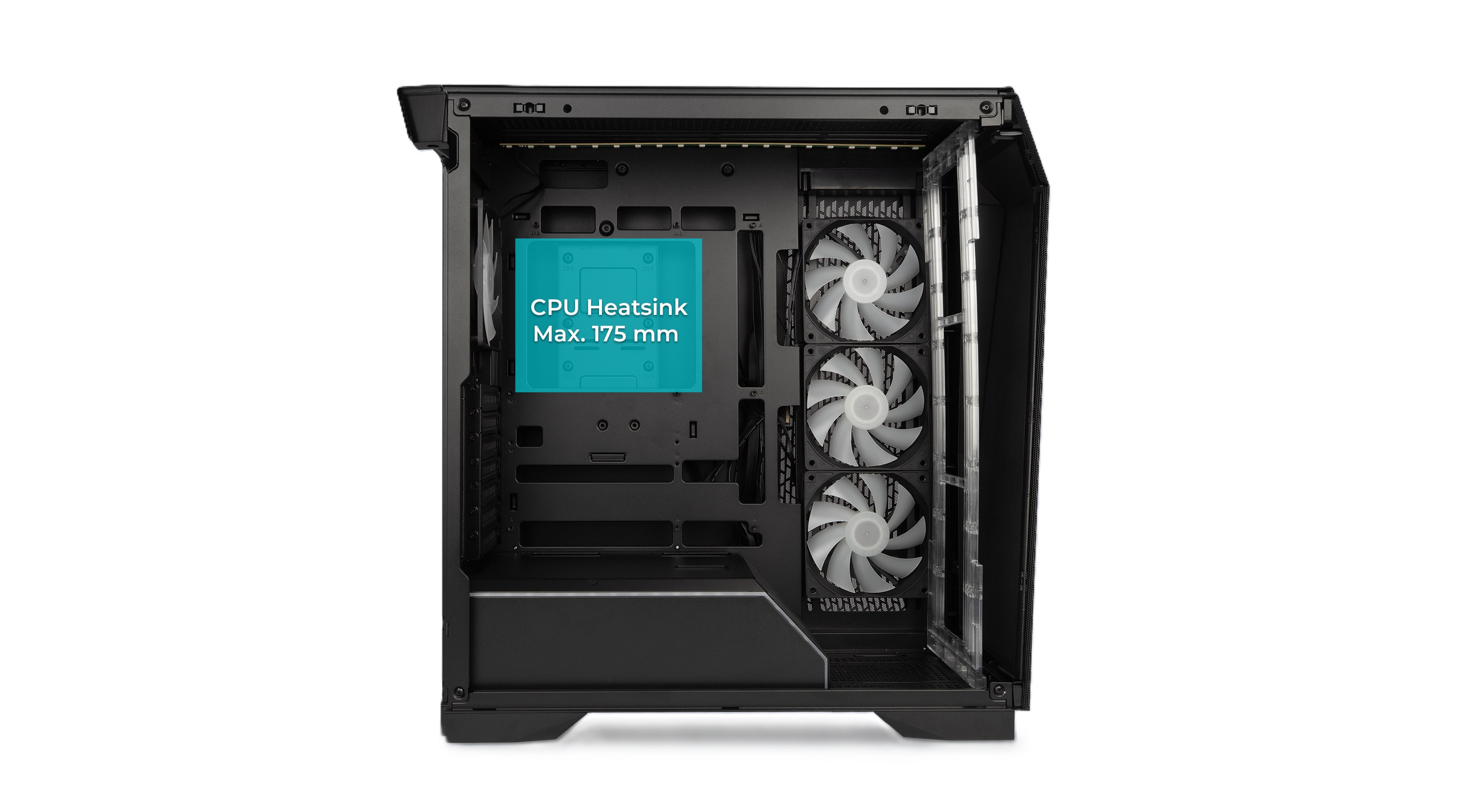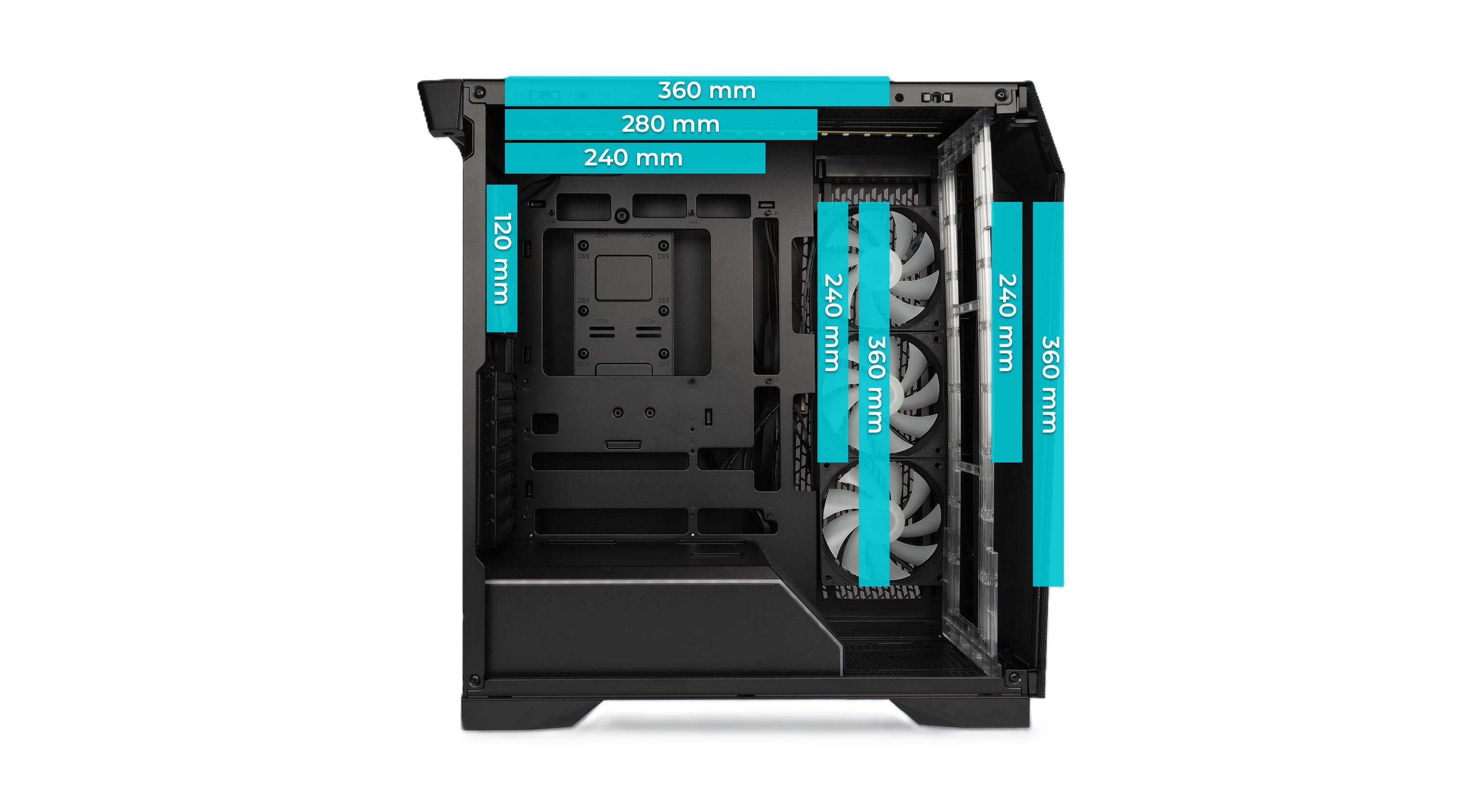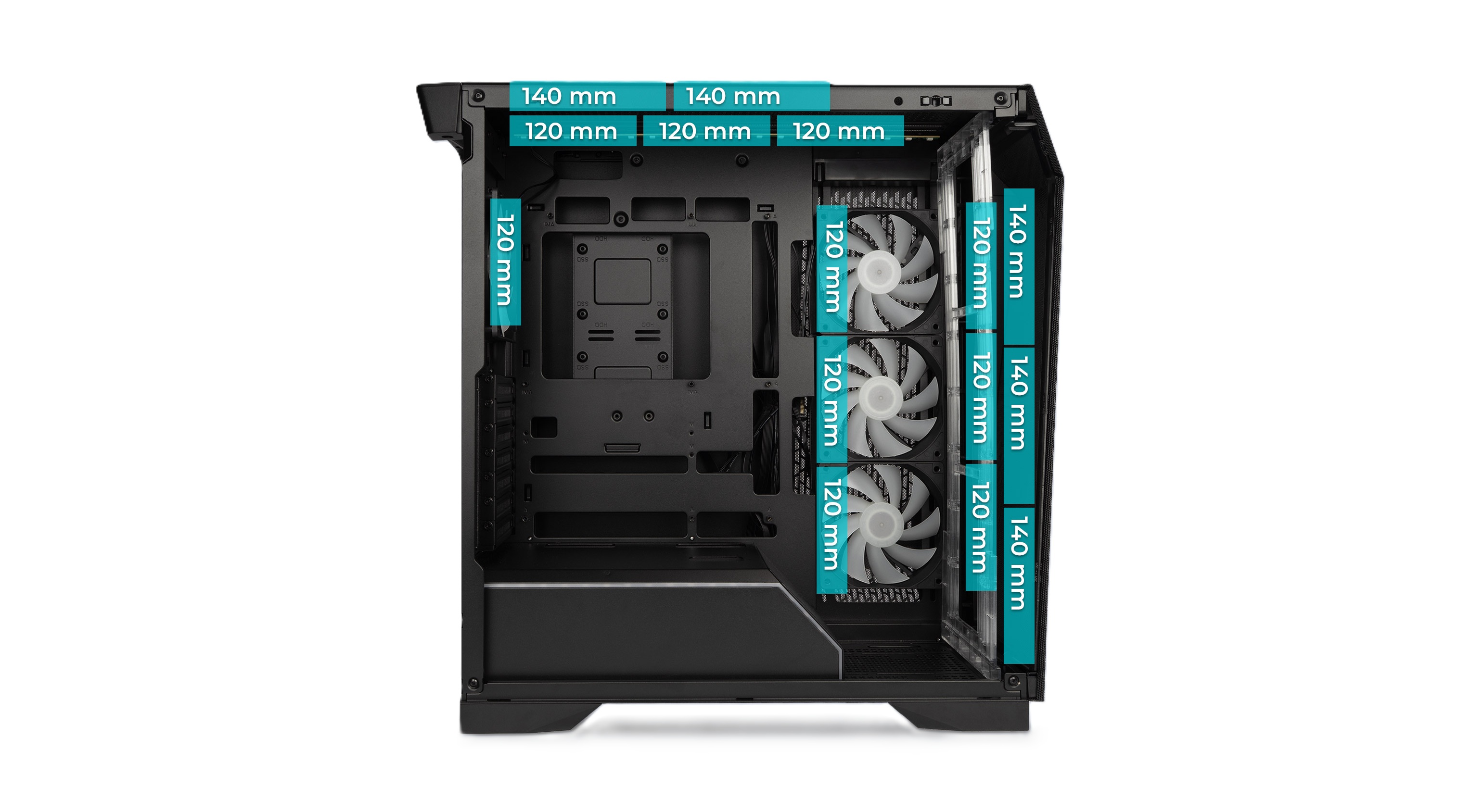 Pojme až 10 ventilátorů a 240, 280 a 360mm radiátorů a je vybaven čtyřmi předinstalovanými ventilátory VORTEX s běžnými lopatkami. Perforovaná přední část a boční panely s geometrickou síťovinou optimalizují proudění vzduchu a zajišťují vynikající chladicí výkon.