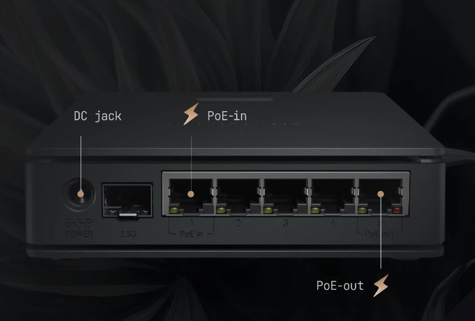 Dvojí možnosti napájení – DC jack nebo PoE-in – a pasivní port PoE-out pro napájení dalšího zařízení MikroTik.
