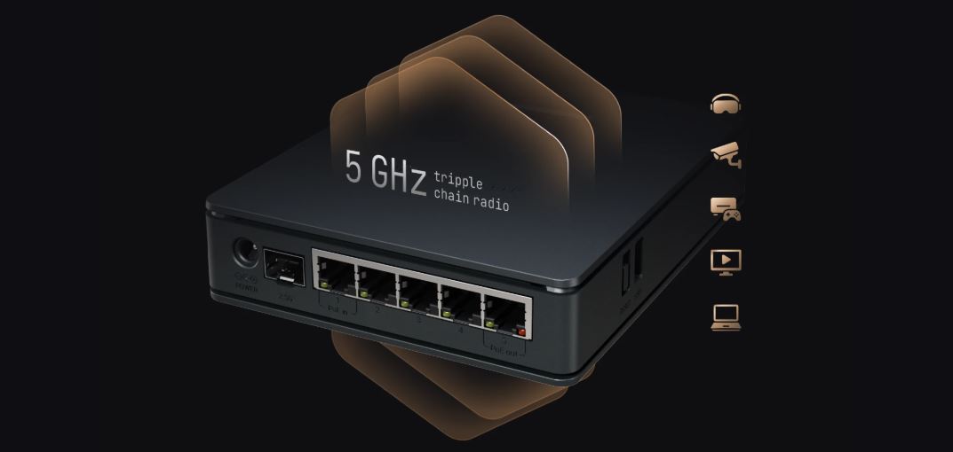 Nový hAP ax S je vybaven trojitým řetězcem 5 GHz, který dosahuje reálné propustnosti kolem 800–900 Mbit/s. To znamená plynulé streamování, rychlejší stahování a stabilní výkon napříč více zařízeními – a to i v přeplněném prostředí.