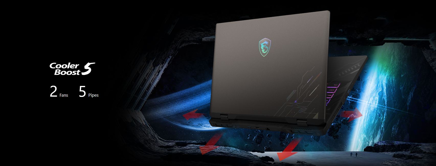Nová konstrukce chlazení umožňuje vícesměrné výstupy proudění vzduchu, což vede k účinnějšímu chlazení. Spolu s konstrukcí se sdílenými trubicemi, která obsahuje pět tepelných trubic mezi CPU a GPU, většími průměry tepelných trubic a exkluzivním tepelným mazivem MSI si můžete být jisti maximálním výkonem i v extrémních herních podmínkách.