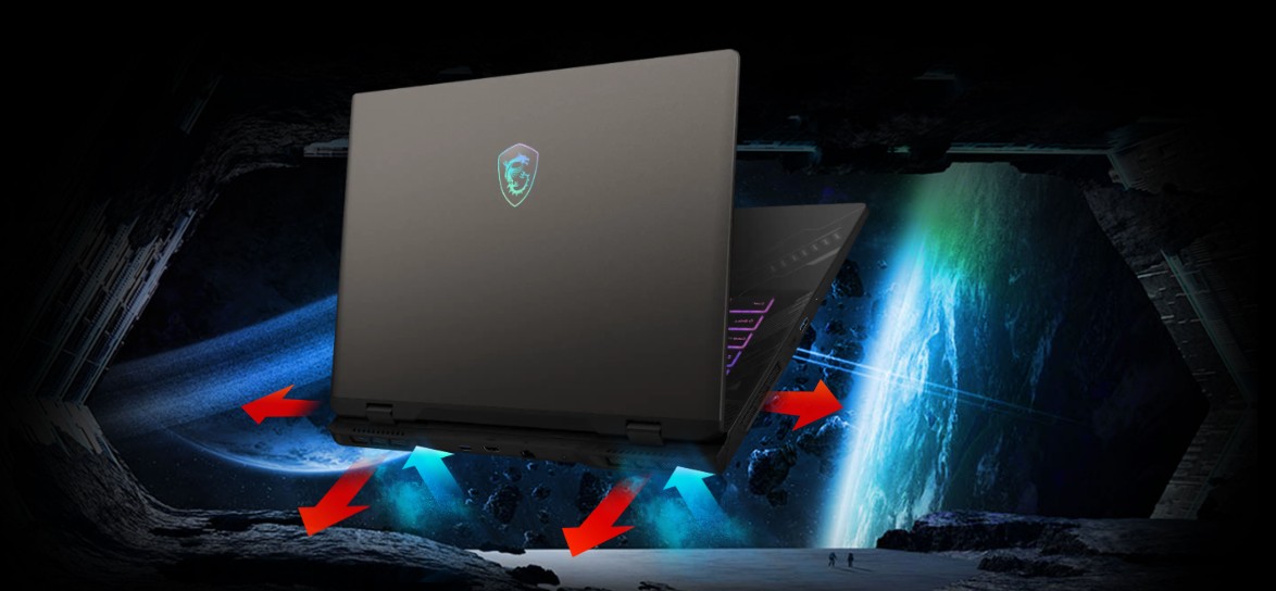 Nová konstrukce chlazení umožňuje vícesměrné výstupy proudění vzduchu, což vede k účinnějšímu chlazení. Spolu s konstrukcí se sdílenými trubicemi, která obsahuje pět tepelných trubic mezi CPU a GPU, většími průměry tepelných trubic a exkluzivním tepelným mazivem MSI si můžete být jisti maximálním výkonem i v extrémních herních podmínkách.