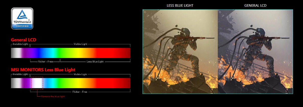 Monitory MSI jsou optimalizovány tak, aby produkovaly méně modrého světla, takže můžete hrát déle bez únavy očí.