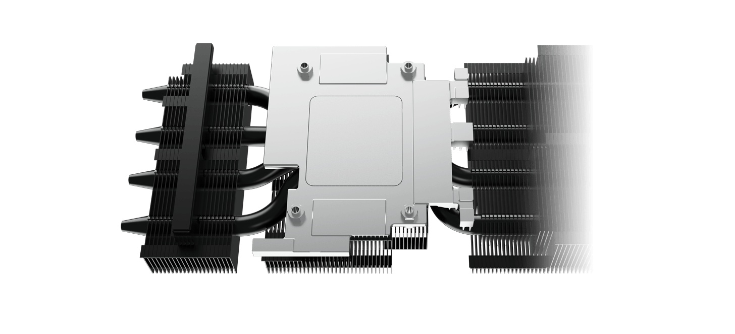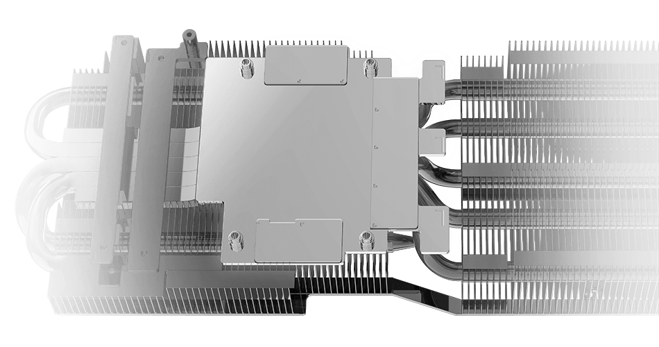 Teplo z GPU a paměťových modulů je rychle zachyceno pevnou niklovanou měděnou základní deskou a rychle přenášeno do jádrových trubek.