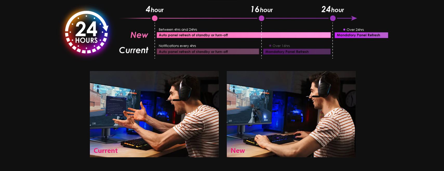 Cyklus aktualizace panelu byl prodloužen z 16 na 24 hodin, což snižuje přerušení během hraní her nebo práce. Uživatelé uvidí připomenutí pouze 30 minut před aktualizací, což zajišťuje minimální přerušení. Aktualizace se stále aktivuje automaticky, když monitor přejde do pohotovostního režimu nebo se vypne, čímž se zachová plná ochrana OLED bez narušení vašeho zážitku.