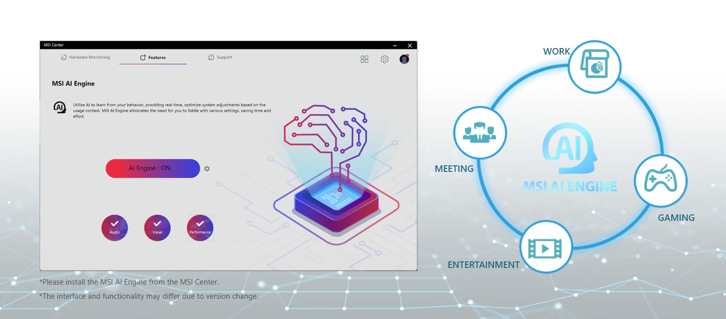Funkce MSI AI Engine automaticky rozpoznává uživatelské scénáře a podle toho přizpůsobuje výkon, zvukové efekty a režim zobrazení, takže není třeba provádět ruční nastavení.