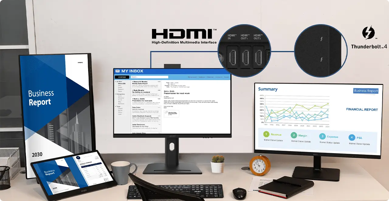Díky výstupu HDMI™ a rozhraní Thunderbolt™ 4 můžete připojit až 4 displeje, což zvýší vaši produktivitu, protože získáte více prostoru na obrazovce pro současné spuštění více aplikací.
