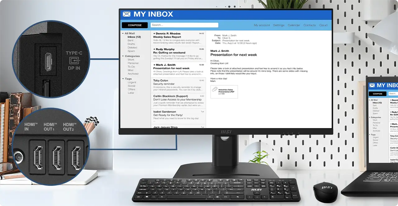 Moderní řada AM273QP AI zahrnuje vstup typu C (DP Alt.) a HDMI™. Díky technologii MSI Instant Display se obrazovka zapne okamžitě po připojení zařízení, takže funguje jako monitor bez nutnosti spouštění.