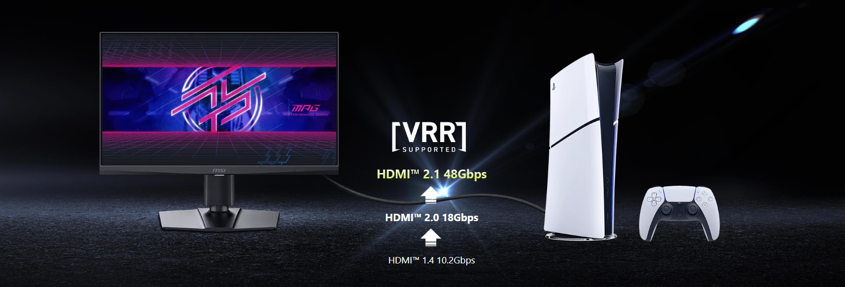 HDMI™ 2.1 poskytuje plnou šířku pásma až 48 Gb/s a podporuje VRR a ALLM pro plynulejší hraní her na konzoli s nízkou latencí až 120 Hz. Díky integrované technologii HDMI™ CEC (Consumer Electronics Control) může monitor komunikovat s ovladači, což jim umožňuje monitor probudit a přizpůsobit režimy různým zařízením.