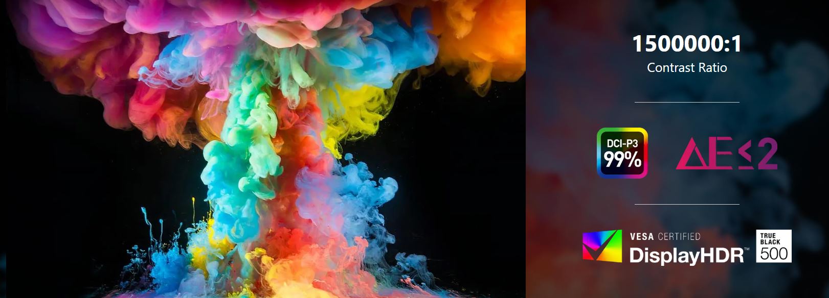 Standard VESA ClearMR měří poměr ostrých a rozmazaných pixelů – čím vyšší hodnota, tím lepší obraz. V kombinaci s extrémně rychlou odezvou 0,03 ms GtG se minimalizuje duchování a rozmazání, takže si užijete ostrý, plynulý obraz a maximální ponoření do děje. Certifikace VESA DisplayHDR™ True Black 500 zaručuje 99% pokrytí barevného prostoru DCI-P3 a přesnost Delta E ≤ 2 pro živé, realistické zobrazení. V kombinaci s ultra vysokým kontrastním poměrem 1 500 000:1 vykresluje hlubokou černou i jasné světelné body, čímž zvýrazňuje každý detail pro výjimečný herní a multimediální zážitek.