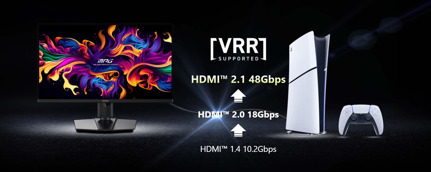 HDMI™ 2.1 poskytuje plnou šířku pásma až 48 Gb/s a podporuje VRR a ALLM pro plynulejší hraní her na konzoli s nízkou latencí až 120 Hz. Díky integrované technologii HDMI™ CEC (Consumer Electronics Control) může monitor komunikovat s ovladači, což jim umožňuje monitor probudit a přizpůsobit režimy různým zařízením.