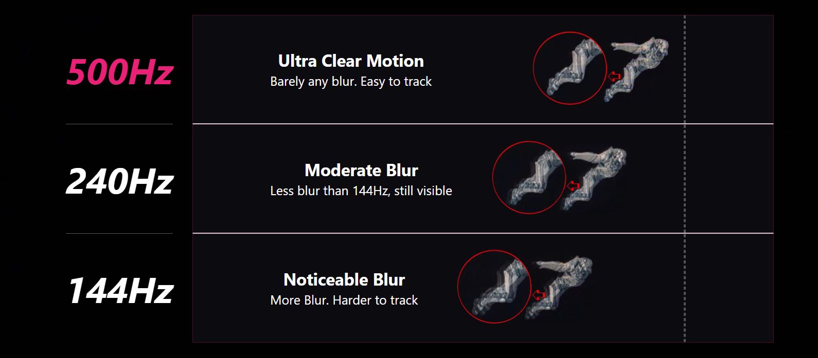 Ultrarychlá obnovovací frekvence 500 Hz minimalizuje rozmazání pohybu a zvyšuje ostrost při rychlé akci, čímž poskytuje ultra přesný obraz, který vám pomůže sledovat, mířit a reagovat s jistotou.