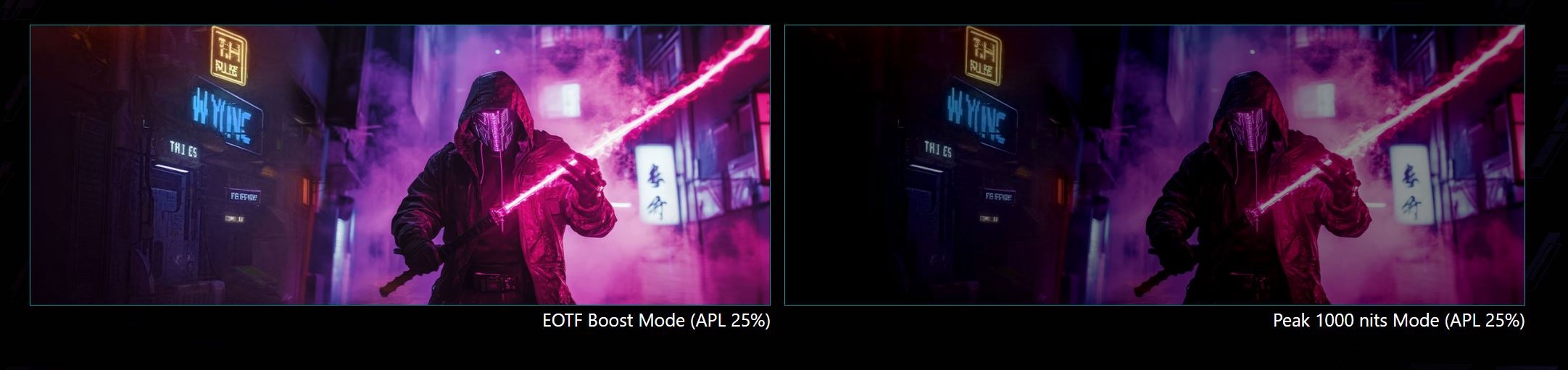 Monitory MSI QD-OLED představují režim EOTF Boost, novou funkci HDR optimalizovanou pro vyšší jas. Ve srovnání s režimem Peak 1000 nits poskytuje EOTF Boost vyšší jas za stejných podmínek APL (průměrná úroveň obrazu). Po zapnutí zvyšuje jas a překonává režim Peak 1000 nits.