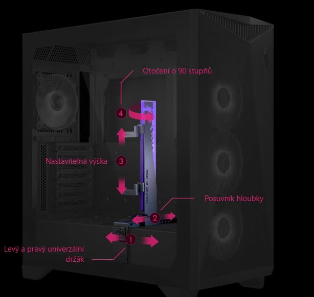 Stojan pro grafické karty lze snadno nastavit pro různé velikosti grafických karet a způsoby instalace bez použití jakéhokoli nářadí, což z něj činí konstrukci vhodnou pro nadšence, která umožňuje snadnou změnu optimální podpůrné polohy.