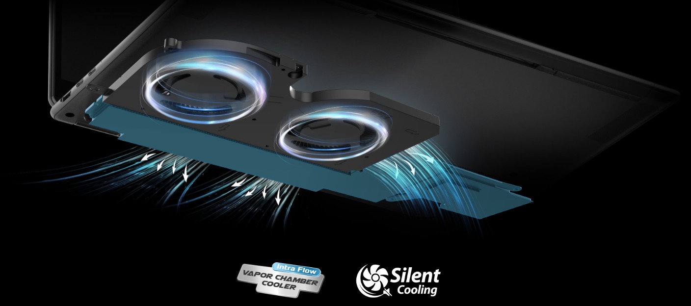 Chladič Vapor Chamber Cooler má větší povrch pro odvod tepla, což umožňuje rychlejší, rovnoměrnější a efektivnější rozptyl tepla v různých směrech, a to i v ultratenkém šasi. V kombinaci s vylepšeným designem Intra Flow udržuje stabilní teploty a konzistentní výkon, přičemž poskytuje téměř bezhlučný provoz s hlučností pouhých 18 dBA pro každodenní použití a zůstává pod 26 dBA v vyváženém režimu.