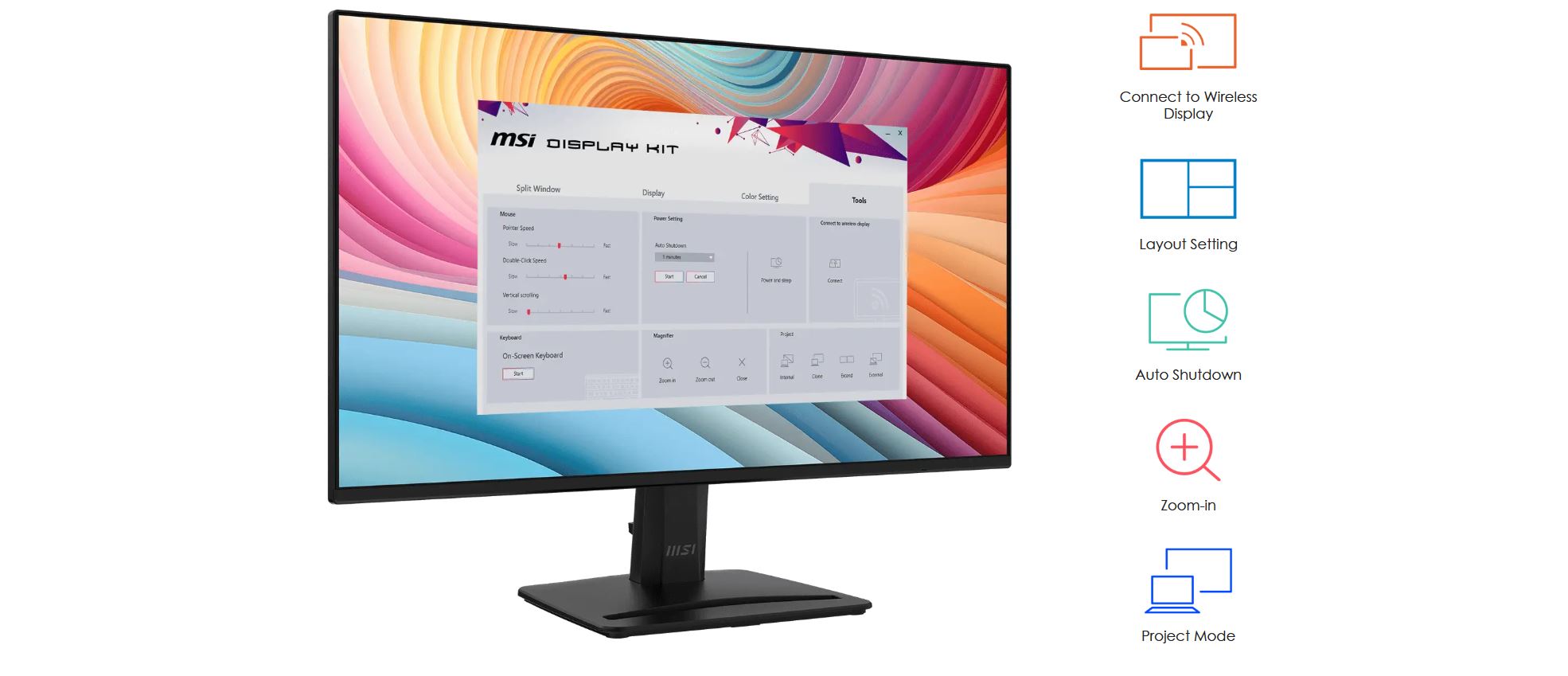 Exkluzivní software Display Kit od společnosti MSI poskytuje nejpohodlnější nástroj, správné zobrazení, které vám umožní číst a zároveň si užívat obraz, a barevný režim pro práci i každodenní použití.