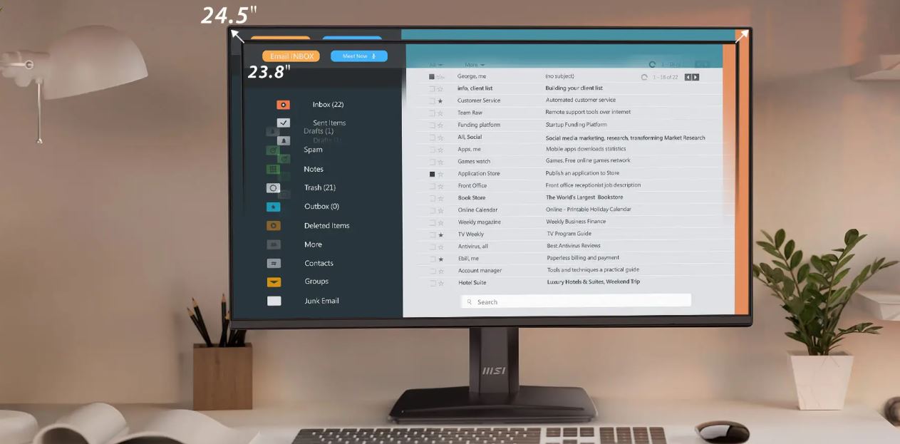 24,5palcová obrazovka je ideální velikostí pro většinu kancelářských a domácích stolů, protože optimálně odpovídá lidskému zornému poli a poskytuje pohlcující a ergonomický zážitek.