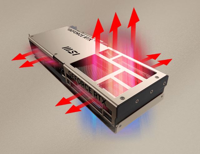 Pevná kovová zadní deska pomáhá zpevnit grafickou kartu při proudění vzduchu nechte projít odpadní vzduch, čímž se účinně sníží přebytečné teplo. Ventilátory se zcela zastaví, když jsou teploty relativně nízké, což eliminuje všechny hluk, když není potřeba aktivní chlazení. Fanoušci se automaticky spustí při zapnutém horku během hraní se opět točí. Teplo z GPU a paměťových modulů je rychle zachycováno pevnou poniklovanou měděnou základní deskou a rychle přenášeno do trubek jádra. Jádrové trubky jsou konstruovány s kontaktní plochou čtvercového tvaru pro maximální zachycení tepla kde zabírá se základní deskou GPU, pak rozptyluje teplo přes chladič optimální tepelný management.