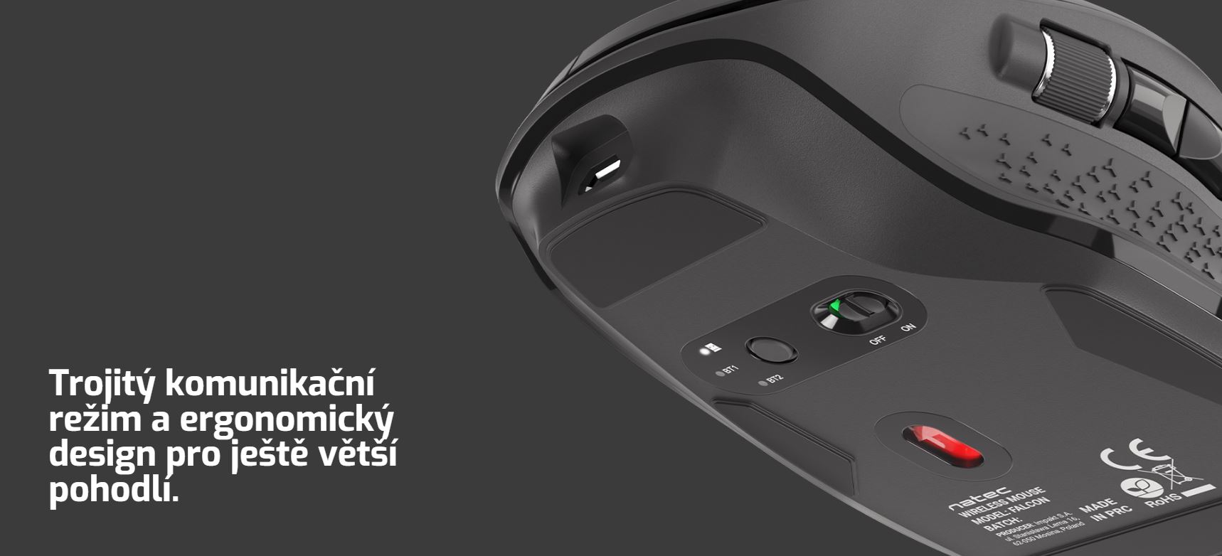 Natec Falcon je moderní bezdrátová kancelářská myš s trojím komunikačním režimem, která umožňuje připojení ke třem zařízením současně. Díky speciálně navrženému tvaru snižuje svalovou zátěž a zlepšuje polohu ruky, navíc zaujme svou funkčností a vysokým komfortem používání.