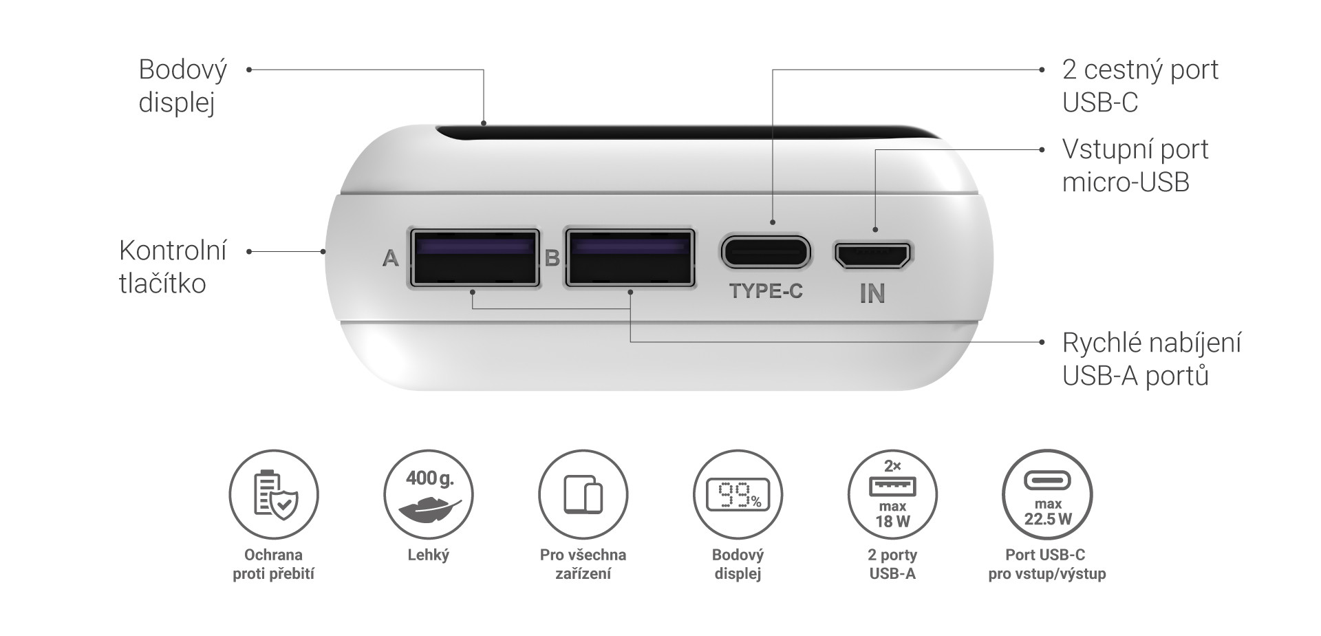 NAVITEL PWR20 MX WHITE monitoruje výkon a kapacitu baterie připojených zařízení, nezávisle rozděluje tok energie a zajišťuje rovnoměrné nabíjení a ochranu nabíjených zařízení před přetížením. Tělo přístroje je vyrobeno z odolného plastu. Jeho povrch je odolný proti poškrábání a oděru. Díky kompaktní velikosti 145x69x28 mm a nízké hmotnosti 400 gramů se externí baterie snadno vejde do kapsy batohu nebo tašky. Přenosná baterie PWR20 MX WHITE bude věrným pomocníkem na výletě, na pikniku v přírodě atd.
