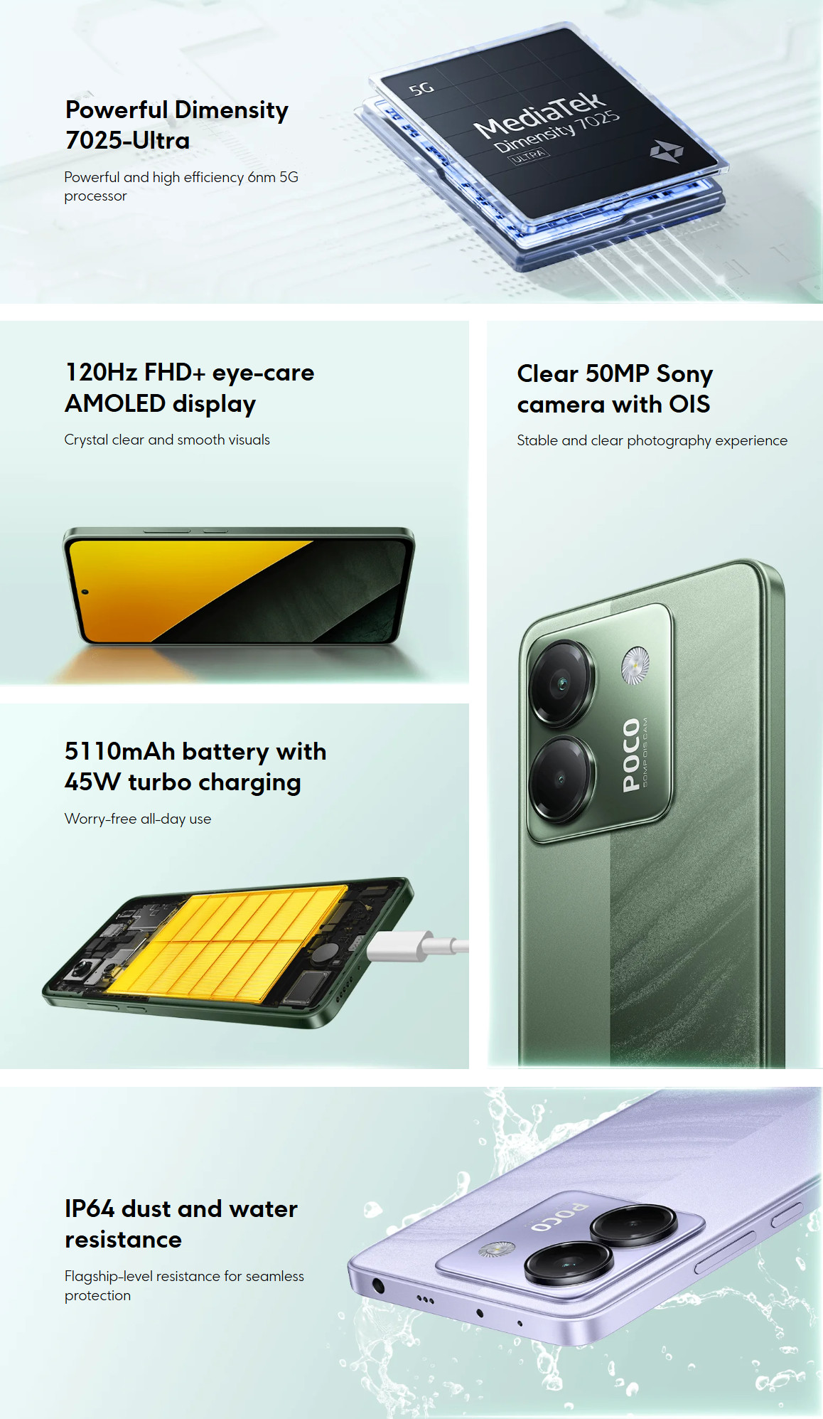 POCO M7 Pro 5G se pyšní 6,67palcovým AMOLED displejem s obnovovací frekvencí 120 Hz a rozlišením 394 PPI, který poskytuje živé barvy a ostrý obraz. Disponuje také ultra vysokým maximálním jasem, který zajišťuje jasné a pohodlné sledování i venku.