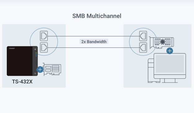 SMB Multichannel: Vhodné pro uživatele v malých/domácích kancelářích. Vyplňte znásobenou dostupnou šířku pásma mezi NAS a přímo připojenými klienty, abyste zrychlili přenos souborů.