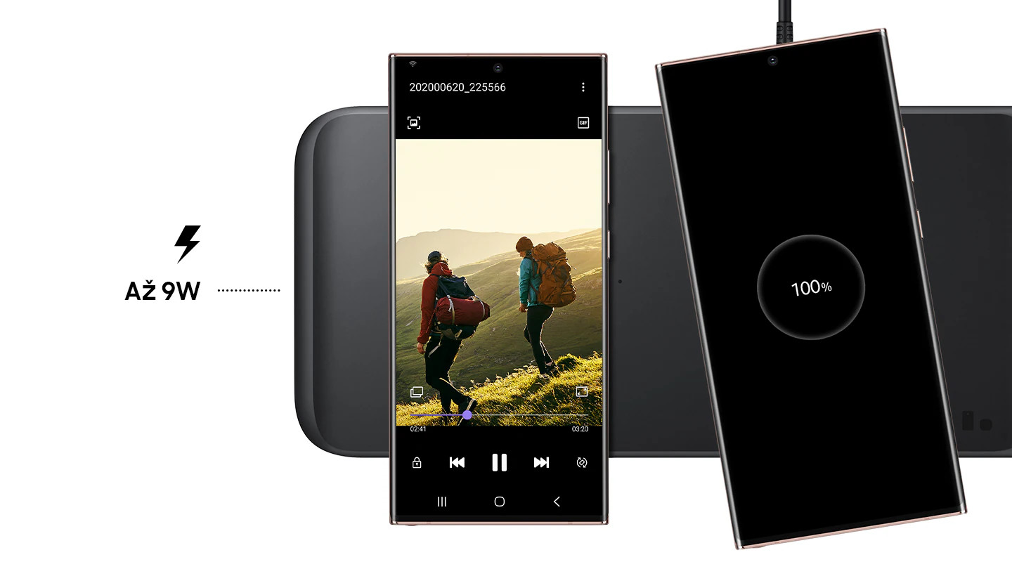 Díky vyhrazenému místu na chytré hodinky Galaxy může být vaše zařízení vždy plné síly, aby vás doprovodilo během celého dne. Vnitřní magnet na pravé straně nabíječky je určen vašim hodinkám, na levé straně můžete nabíjet telefon, sluchátka řady Galaxy Buds a další zařízení.