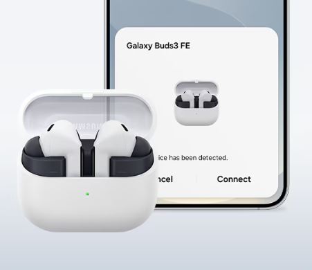Poslouchejte celé hodiny. Snadno připojte sluchátka Galaxy Buds3 FE ke svým zařízením Samsung Galaxy. Stačí otevřít nabíjecí pouzdro, aby se spárování spustilo automaticky, klepnout nebo kliknout na tlačítko „Připojit“ na zařízení – a můžete začít.