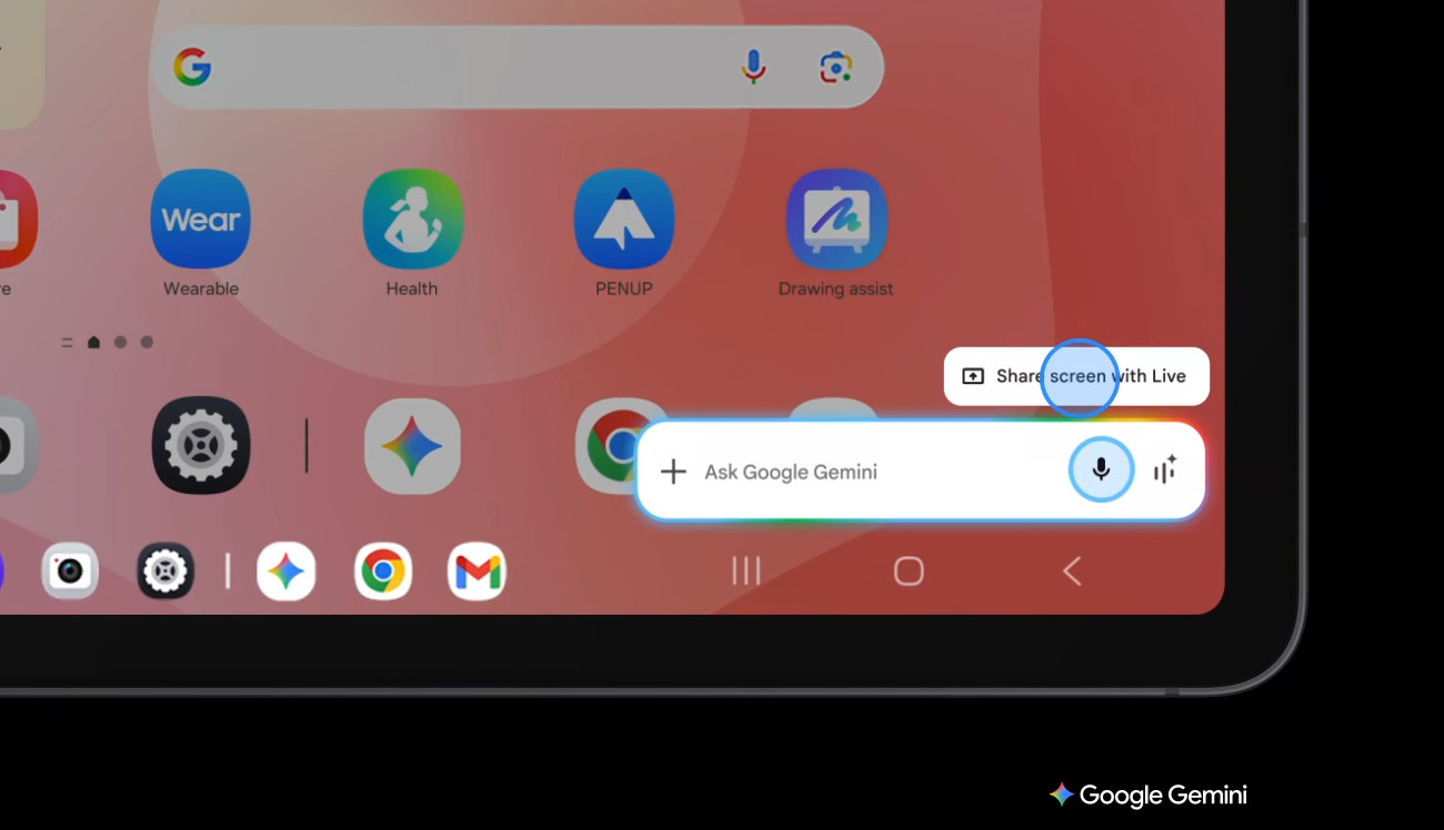 Spusť režim Go Live a sdílej kameru s Gemini na svém Galaxy Tab S11, abys získal pomoc s tím, co vidíš. Stačí dlouze podržet boční tlačítko, spustit sdílení obrazovky nebo pohledu z kamery a zeptat se Google Gemini na radu. Vedej volný rozhovor, který ti pomůže najít odpovědi, které hledáš.