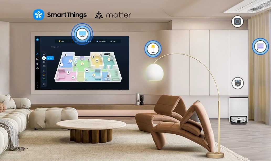 S integrovaným SmartThings Hub snadno propojíš a přizpůsobíš si všechna chytrá zařízení kompatibilní se SmartThings. Ovládej celou domácnost ze své TV.