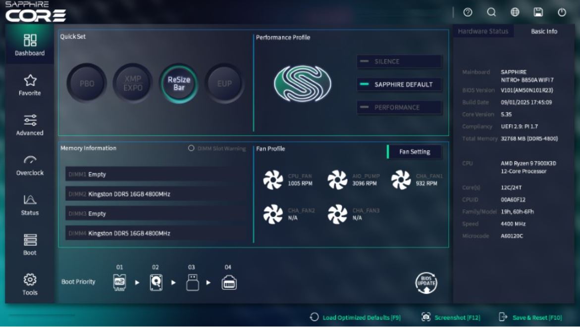 2) V Quick Set můžete rychle aktivovat funkce přetaktování, včetně přetaktování CPU (PBO), přetaktování paměti (XMP/EXPO), zvýšení výkonu GPU (Resize Bar) nebo nastavení úspory energie (EUP).
