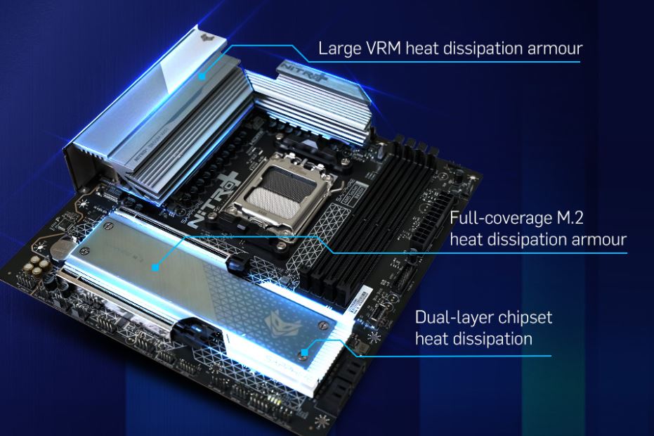 Vyrobeno v estetickém stylu NITRO+ s hliníkovým chladičem s vysokou tepelnou vodivostí, navrženým pro výkonné chlazení. Pevné dvouvrstvé pancéřování čipové sady zvyšuje tepelný výkon i stabilitu systému a zároveň dodává odvážný, výkonný vzhled.