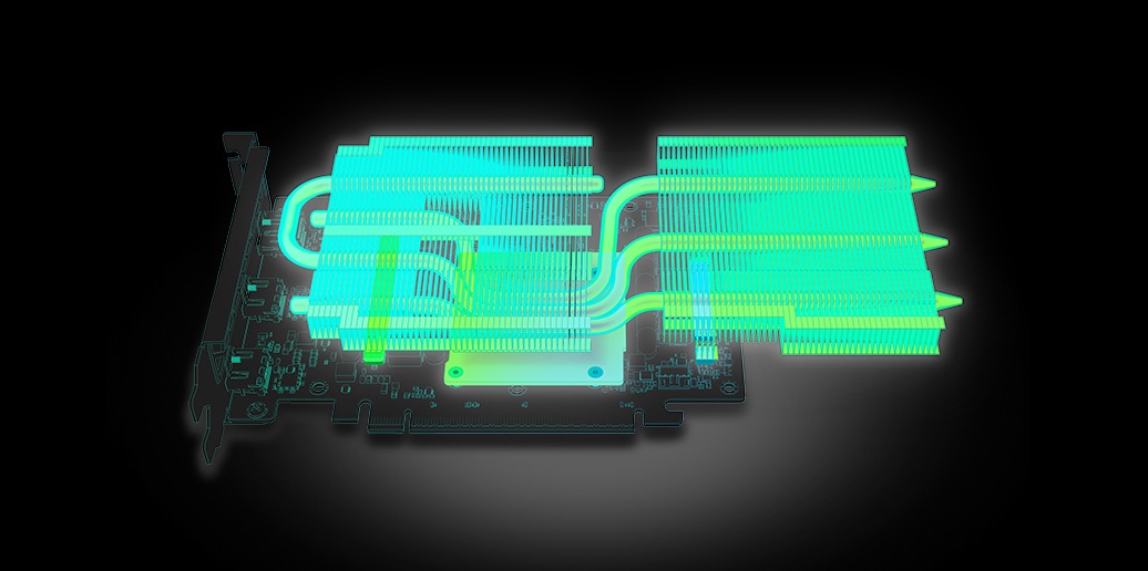 GPU je namontováno na vysokohustotní 6vrstvé 2oz měděné desce s vysokým TG, aby vyhovovalo vysoké rychlosti, vysokému proudu a zvýšeným požadavkům na napájení GPU a paměti a zajistilo vysokou stabilitu desky během provozu.