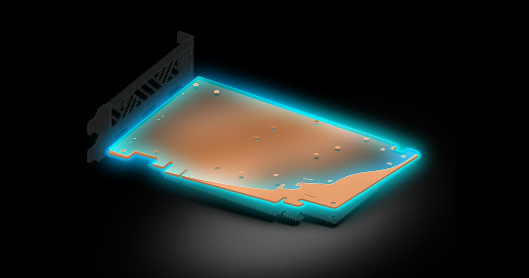 Zadní deska vyrobená výhradně z hliníku poskytuje dodatečnou tuhost, která zaručuje, že se nic neohýbá a dovnitř se nedostává prach. Pomáhá také chlazení karty tím, že zvyšuje odvod tepla.