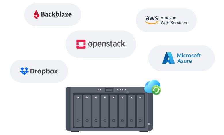 Automaticky synchronizujte data mezi zařízením Synology NAS a velkými poskytovateli cloudu, včetně služeb BackBlaze B2, Dropbox, Google Drive a Microsoft OneDrive. Podpora více protokolů, šifrování na straně klienta a nastavitelné ovládání synchronizace a šířky pásma umožňují efektivní správu úložiště mezi různými platformami.