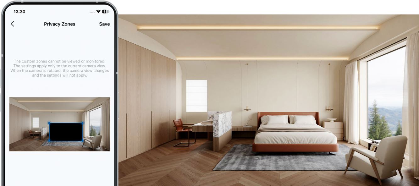 Nastavením přizpůsobitelných blokovacích zón zamezíte nahrávání určitých prostor, abyste se nemuseli obávat úniku osobních informací. Odfiltrujte všechny osobní prostory, jako je vaše postel, a nahrávejte pouze místa, která vyžadují monitorování, jako jsou dveře a okna, abyste zajistili, že vaše soukromí zůstane soukromé.