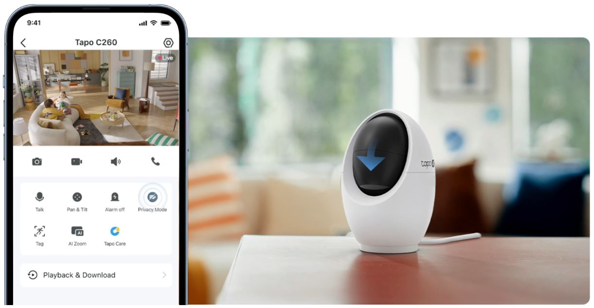 Udržuje vaše soukromí na další úrovni - objektiv je fyzicky blokován krytem pouhým jedním klepnutím prostřednictvím aplikace Tapo.