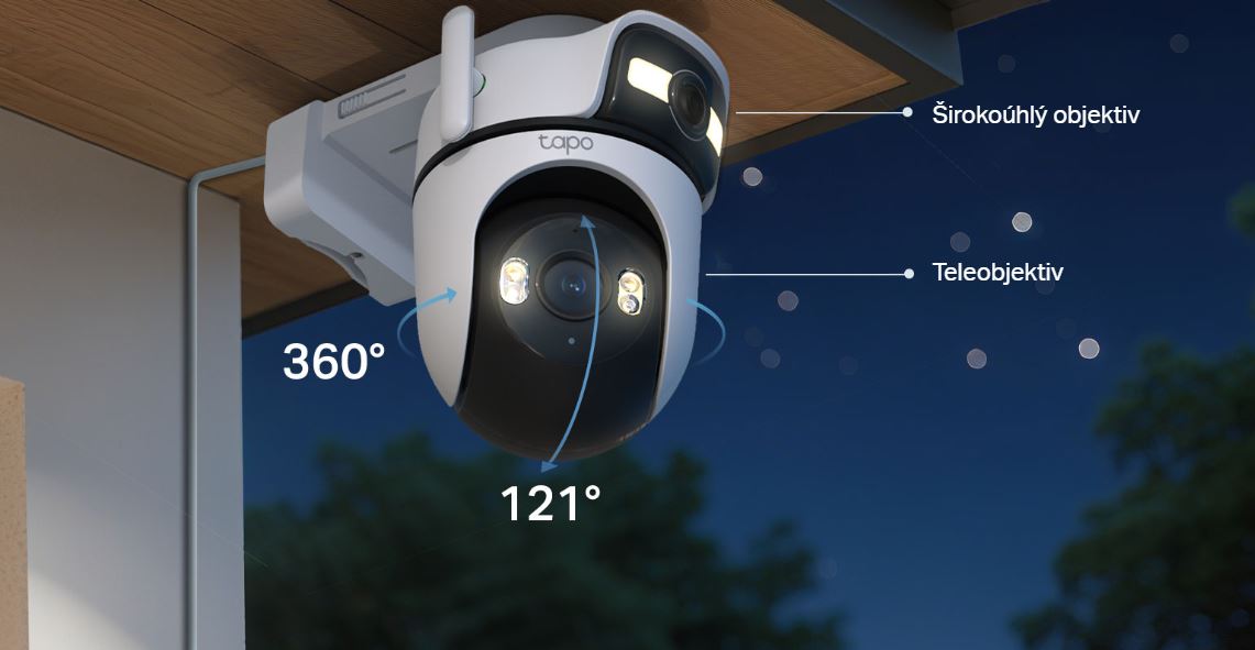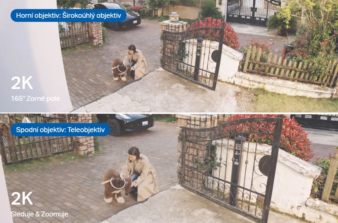 Horní širokoúhlý objektiv je pevný, ale podporuje manuální nastavení panorámování (270°) a náklonu (-30° až -10°) pro nejlepší pozorovací úhel. Spodní teleobjektiv disponuje automatickým panorámováním a nakláněním pro sledování pohybu nebo změnu zaostření mezi různými oblastmi podle potřeby.
