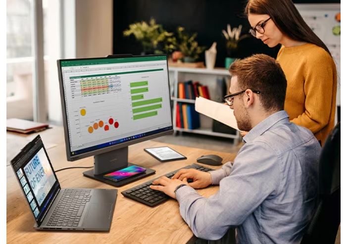 Počítač ThinkCentre Neo 50a Gen 5 představuje spojení inovací s každodenními úkoly. Integrované funkce pro zvýšení efektivity, jako je režim Modern Standby a volitelný Microsoft Copilot – integrovaný asistent s umělou inteligencí – zvyšují každodenní produktivitu. Copilot je plně integrován s Office 365 a dokáže urychlit tvůrčí proces ve standardních aplikacích, automatizovat opakující se úkoly, shrnout diskuse a mnoho dalšího. Funkce sdíleného displeje umožňuje účelné spojení pro týmovou práci nebo zábavu – stačí připojit notebook k portu HDMI a vychutnat si zvuk a obraz na velké obrazovce AIO.