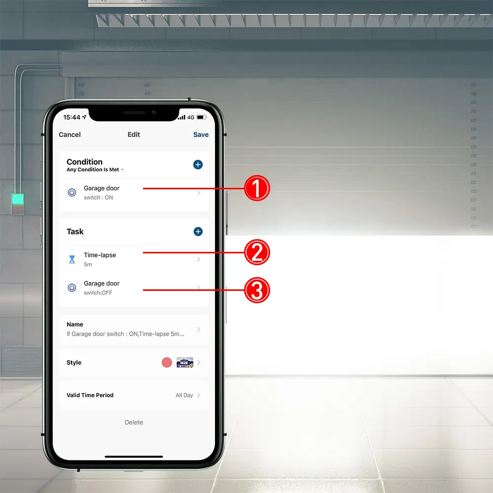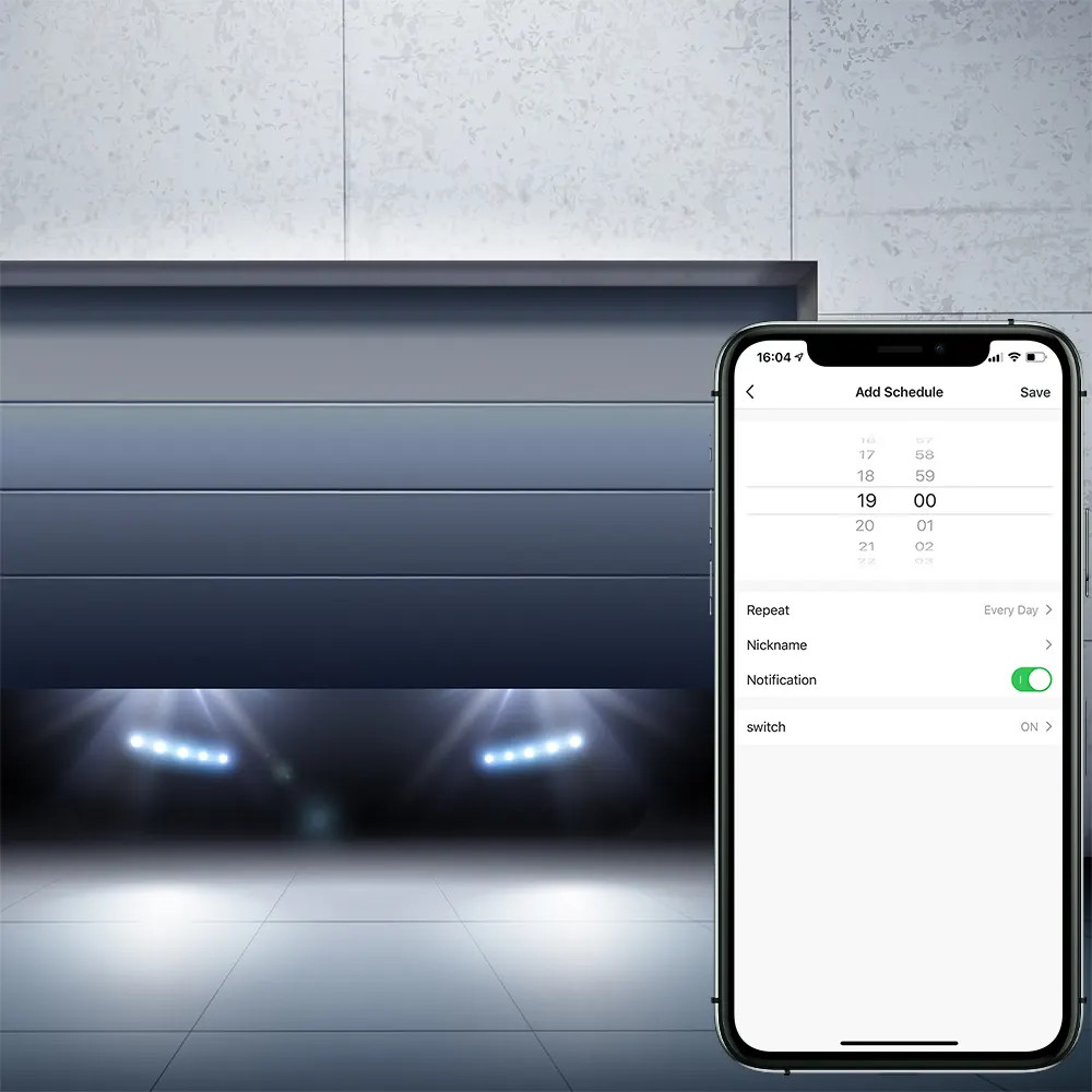 Naplánujte si WiFi ovládání garážových vrat nebo si nastavte časovač pro automatické otevírání/zavírání garážových vrat. Integrujte jej do inteligentních nebo automatizovaných scénářů a automaticky provede příkazy na základě vašich specifikací. Například můžete nastavit sadu tak, aby automaticky zavřela garážová vrata 5 minut po jejich otevření.