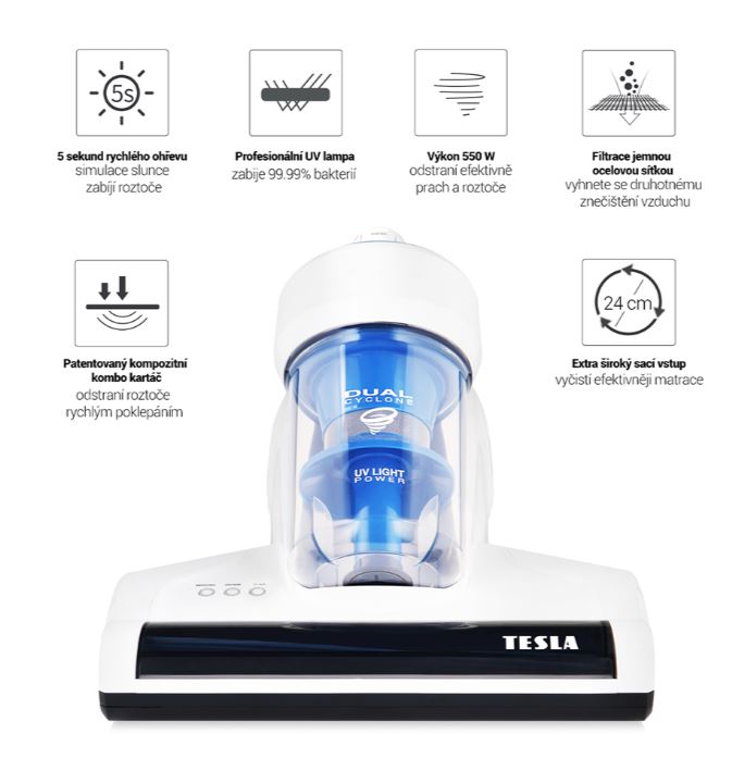 TESLA LifeStar UV550 si při čištění poradí s hluboko usazeným prachem, zvířecí srstí a jinými nečistotami. Výkonná UV-C lampa a horký vzduch zničí 99.9% bakterií, alergenů a roztočů, sterilizuje matrace, polštáře, čalounění a snižuje tak riziko vzniku astmatu a kožních onemocnění. Rotační turbo kartáč pronikne hluboko do vláken textilu a efektivně odstraní nežádoucí mikroorganismy.